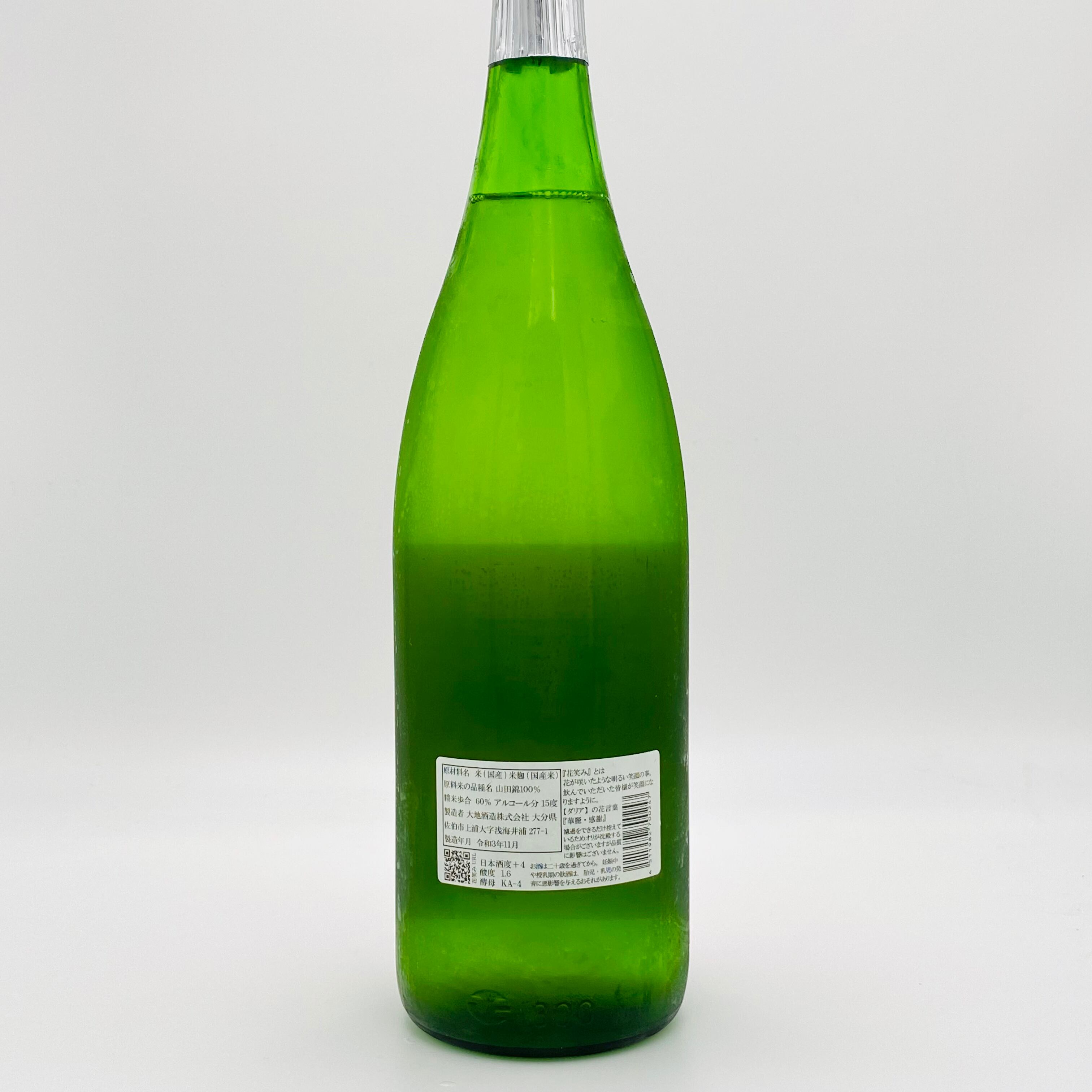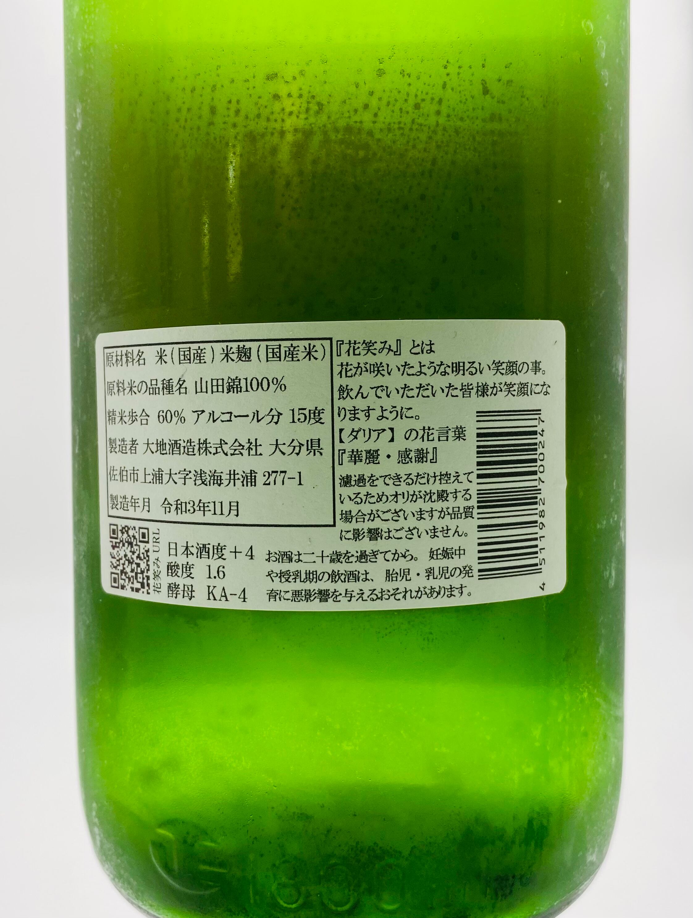 1885年(明治18年)創業の蔵。5代目当主は大地正一氏。清流番匠川の伏流水で醸す酒は最盛期年間560万石。5代目当主の大池正一氏は蔵を残したい一心で頑張ってきたが子供たちは後を継ぎませんでしたが、そこへ「酒造りをしたい」と訪ねてきたのが佐伯市上浦で酒販店を営んでいる池田敬氏。社長と杜氏を兼ねて孤軍奮闘していた大地氏を手伝い始めた。「どこまで本気なのか」との思いが消えない大地氏に対し。池田敬氏は酒米を自作して持ち込むことで本気度を示した。5年前に市内の田んぼを借りて山田錦を作付けし約500kgを収穫。熱意を確認した大地氏は本格的に酒造りを教え込み、2015年には純米吟醸酒「龍爽香(さちかぜ)」をリリース。そして大分県内の2つの蔵元で11年間、酒造りを技術を学んだ池田敬氏の弟、池田司氏が杜氏を引き継ぎ、2019年に花笑みが誕生しました。